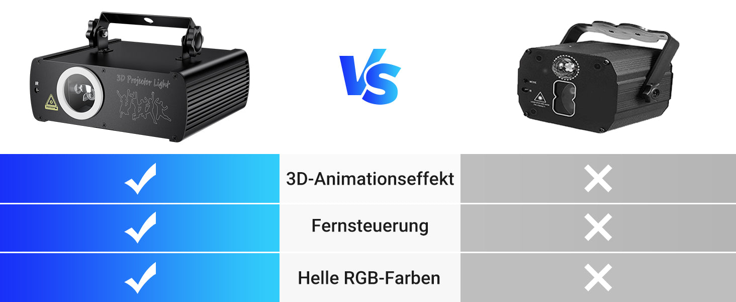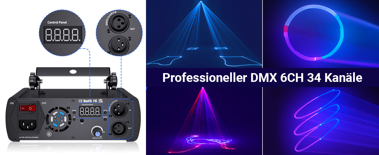 | Besondere Eigenschaften: | Gig RGB-Vollfarb-Laserlicht, Laserstrahlen & Grafikmuster, 3D-DJ-Laser, Netzbetrieb, DMX512-kompatibel |